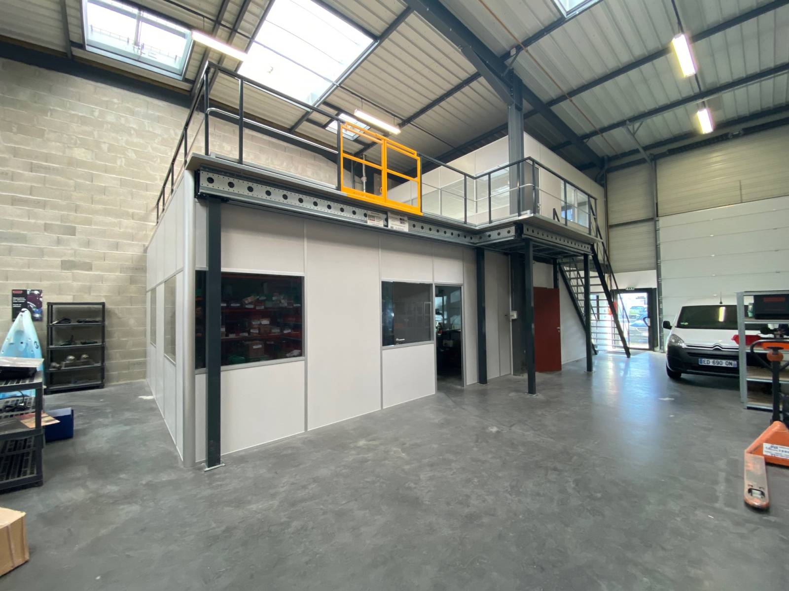 Cette solution est souvent utilisée pour avoir un bureau d'atelier sous la mezzanine et un espace de stockage au R+1.